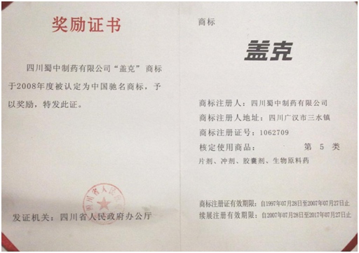 公司高度重视品牌战略,依法注册了“盖克”、“蜀中”、“三星堆”、“阿莫锋”、“益善源”、“蓉通”、“金年会最新登录”等108件注册商标,1999年“盖克”、2003年“蜀中”、2007年“三星堆”被认定为德阳市知名商标,2001年“盖克”、2004年“蜀中”被认定为四川省著名商标, 2008年“盖克”商标被国家工商行政管理总局认定为“中国驰名商标”。2017年3月,公司盖克牌、金年会最新登录牌阿莫西林胶囊和多酶片被四川省人民政府授予四川名牌产品称号。2016年,公司实现营业收入66373万元,利税7600万元;2017年,公司实现营业收入75045万元,利税7572万元。公司2017年被命名为德阳市第七批院士专家工作站,2016-2018连续三年被德阳市人民政府确定为重点龙头企业。