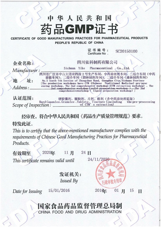 2000年1月,公司通过了国家食品药品监督管理局认证评审中心组织的现场评审检查,取得了公司第一张GMP证书。 其后,公司先后多次投入资金,改建了质管部、综合车间、中药前提车间、口服固体制剂车间等;添置了大量检验和生产设备,进行了多次GMP认证。并且分别于2005年、2010年、2015年通过了GMP重新认证。